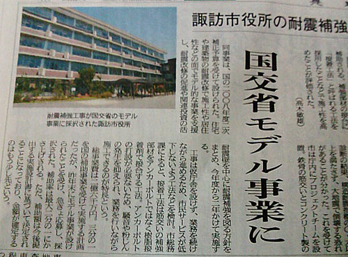 今日の新聞に! 今日の長野日報にこんな記事が!! アローで行っている諏訪市役所の耐震補強工事が、国交省の「住宅・建築物耐震改修モデル事業」に採択されました! -------------------------------------------------------------- ランキングサイトに参加しています↓ バナーをクリックして頂けると大変励みになります! ←にほんブログ村 住まいブログランキング ←人気ブログランキング 建設リフォーム PR