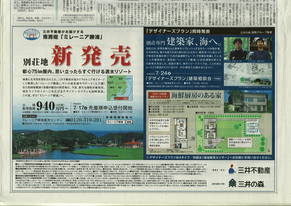 日経に載りました! 両角氏のプランと本人の写真が 7/15の日経に掲載されました! ミレーニア勝浦の売り建てプランです。 7/24(土)に建築相談会も行われます! 予約が必要みたいですので、詳細はこちらをご覧ください。 -------------------------------------------------------------- ランキングサイトに参加しています↓ バナーをクリックして頂けると大変励みになります! ←にほんブログ村 住まいブログランキング ←人気ブログランキング 建設リフォーム ←住まいるブログランキング PR